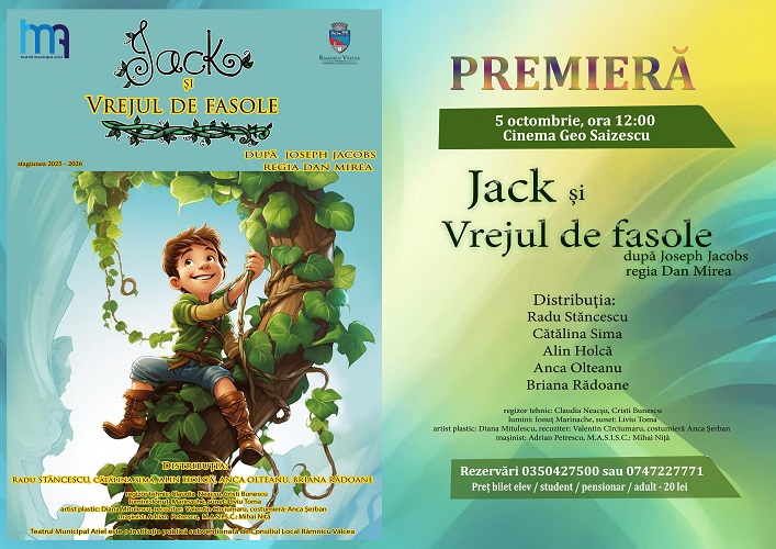 În data de 5 octombrie 2025, Teatrul Municipal „Ariel” marchează deschiderea oficială a stagiunii 2025-2026 cu premiera spectacolului „Jack și vrejul de fasole” de Joseph Jacobs, regia Dan Mirea, la Cinema Geo Saizescu, la ora 12:00.