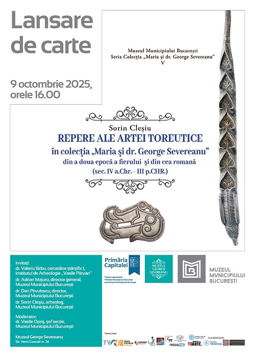 Muzeul Municipiului București invită publicul joi, 9 octombrie 2025, ora 16:00, să participe la evenimentul de lansare a volumului „Repere ale artei toreutice în colecția «Maria și dr. George Severeanu» din a doua epocă a fierului și din cea romană (sec. IV a.Chr. – III p.Chr.)”, autor dr. Sorin Cleșiu. Lansarea va avea loc la Muzeul George Severeanu (Strada Henri Coandă nr. 26, București).
