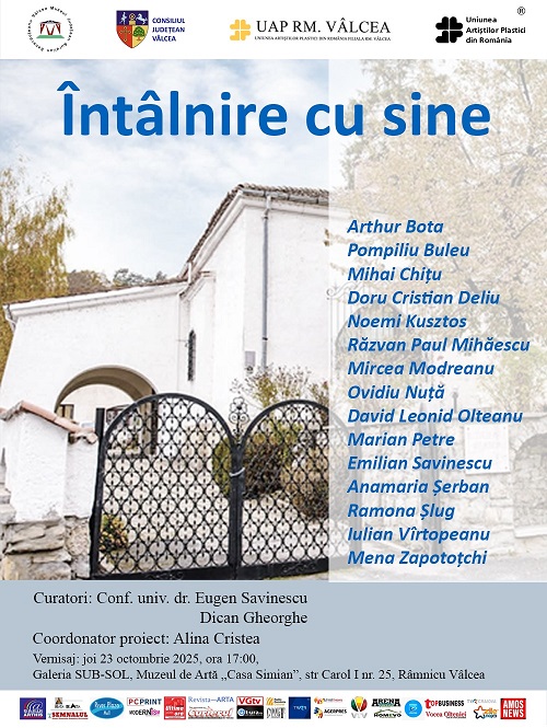 Secția de Artă a Muzeului Județean „Aurelian Sacerdoțeanu” Vâlcea, în parteneriat cu Consiliul Județean Vâlcea, cu Filiala Râmnicu Vâlcea a UAP din România și Uniunea Artiștilor Plastici din România, organizează joi, 23 octombrie 2025, la ora 17ꓽ00, în Galeria SUB-SOL a Muzeului de Artă „Casa Simian”, vernisajul expoziției de artă contemporană „Întâlnire cu sine”. Curatoriꓽ Eugen Savinescu și Gheorghe Dican, Coordonator proiectꓽ Alina Cristea