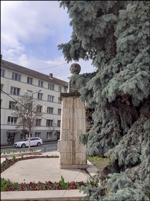 Bustul, că despre un bust este vorba, se află într-un amplasament peisagistic de toată jena vizuală. Este pitit sub gigantice tufe circulare, „cocoșat” de arbuști… cocoțați pe soclul său. Așa că, din nepăsare sau alte cauze necunoscute nouă, marele fizician a devenit… mic, micuț de tot!