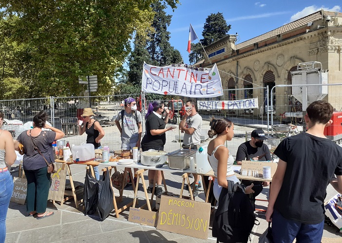 Un alt carton cu inscripția „Macron démission!” stă rezemat de măsuța improvizată a cantinei. La scurt timp, observ mai în spate spre parcul de alături, fixată pe un gard metalic, încă o altă pancartă cu îndemnul: „Participation!”