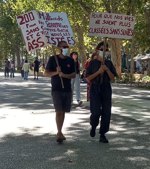 Intrăm în piață venind de pe strada Foch, una din principalele două artere comerciale ale orașului, și încercăm să ajungem în partea opusă a pieței spre Bulevardul Frederic Mistral. Trecem printre manifestanții care cu trei ore înainte erau doar câteva sute, liniștiți docili și pașnici. Acum sunt câteva mii, aproximativ 5-6.000, sunt vioi, guralivi, iar animația este generalizată. Mai toți scandează cu foc lozinci care pentru noi, românii, sună cam așa: „Jos capitalismul!, „Jos sistemul!”, „Jos Macron!” etc..