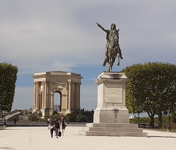 Continuăm drumul spre partea vestică a zonei, cea mai înaltă a urbei, Promenada Peyrou, amenajată de arhitectul Giral încă de la 1689, care se întinde pe 4,59 hectare. Cunoscut și ca „Piața Regală”, ansamblul se află la periferia bătrânului cartier L’Écusson și este renumit prin impresionantul arc de triumf, statuia monumentală ecvestră de la 1828 a lui Ludovic al XIV-lea, binefăcătorul orașului, precum și pentru panorama uimitoare pe care o oferă asupra Munților Cevennes, Mării Mediterane și asupra orașului.