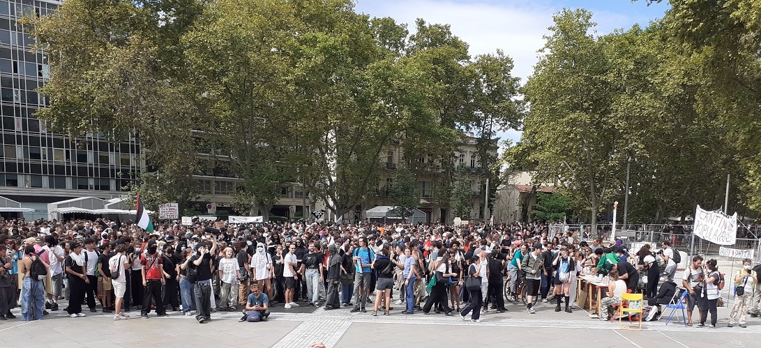Este ora prânzului. Circa 600-700 de tineri sunt răspândiți în „Place de la Comédie”, în grupuri-grupulețe.