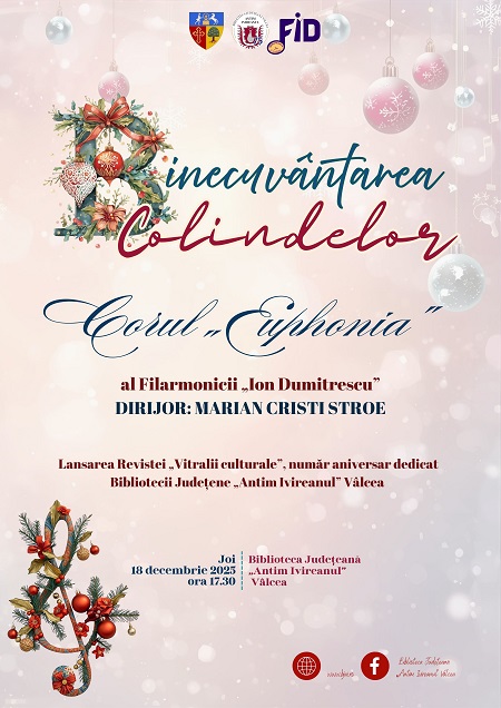 Va asteptam cu mare placere joi, 18 decembrie 2025, ora 17.30, la Biblioteca Județeană „Antim Ivireanul” Vâlcea, la concertul „Binecuvântarea colindelor”.