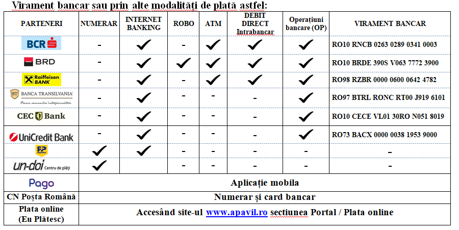 Online, cu cardul bancar, direct din contul de client – accesând site-ul www.apavil.ro – secțiunea Portal