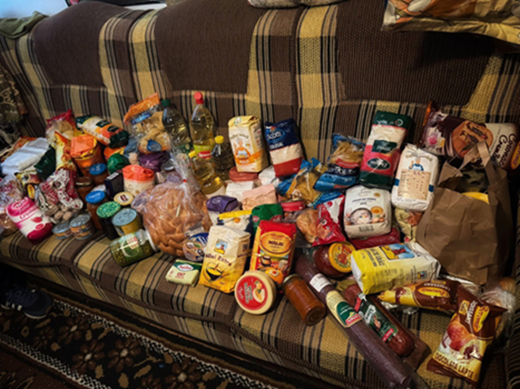 Alimente adunate de copiii din Vlădești coordonați de Andrei Ovidiu Leonte, preot paroh, și Marius Colia Muscalu, preot coslujitor
