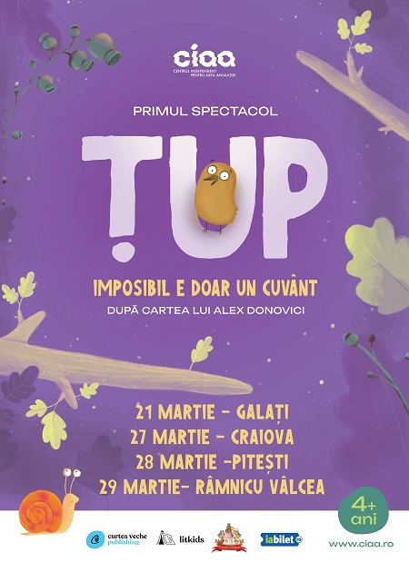 „Țup–Imposibil e doar un cuvânt”, inspirat de cartea scrisă de Alex Donovici și montat de Eduard Cîrlan, aduce în fața copiilor o poveste emoționantă despre curaj, acceptare și depășirea limitelor. Protagonista, Țup, este un pui de ciocârlie născut fără aripi și cu picioare scurte, care descoperă că adevărata putere vine din interior. Povestea îi învață pe cei mici că, indiferent de obstacole, cu determinare și încredere în sine pot depăși orice dificultate.
