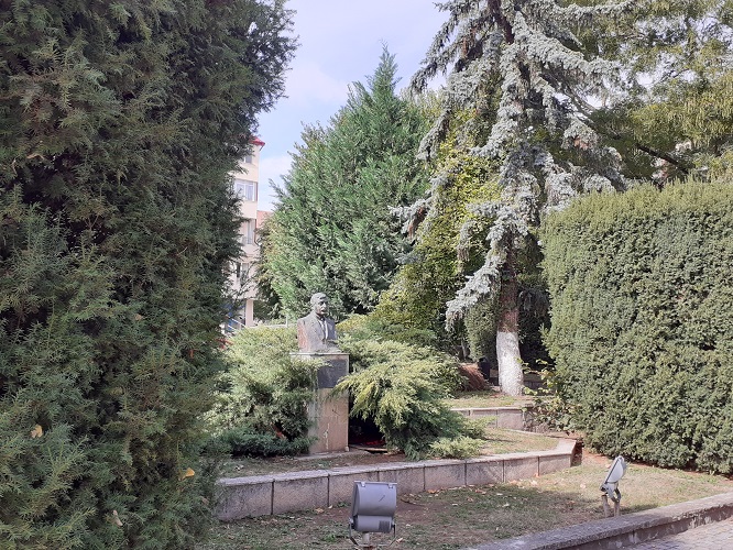 Bustul, că despre un bust este vorba, se află într-un amplasament peisagistic de toată jena vizuală. Este pitit sub gigantice tufe circulare, „cocoșat” de arbuști… cocoțați pe soclul său. Așa că, din nepăsare sau alte cauze necunoscute nouă, marele fizician a devenit… mic, micuț de tot!